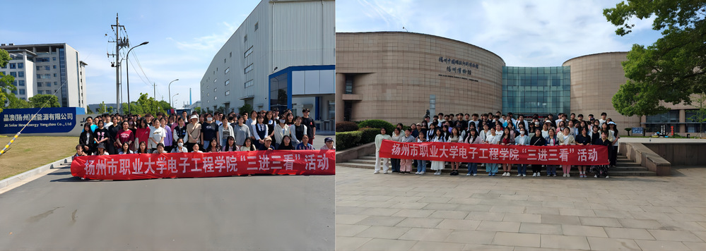 近日,电子工程学院组织94名学生参加扬州市人力资源市场管理办公室主办的“三进三看”活动。同学们实地参观了晶澳(扬州)新能源有限公司和扬州博物馆。