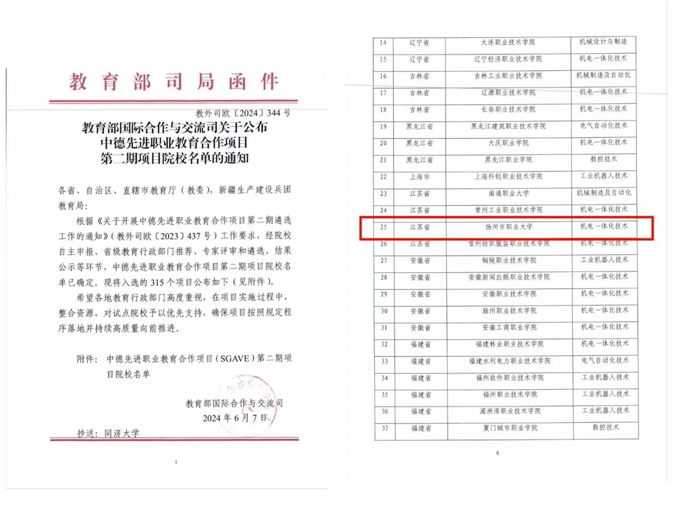 近日,教育部国际交流司公布了中德先进职业教育合作项目(SGAVE)第二期项目院校名单,必赢官网机电一体化技术专业成功入选。