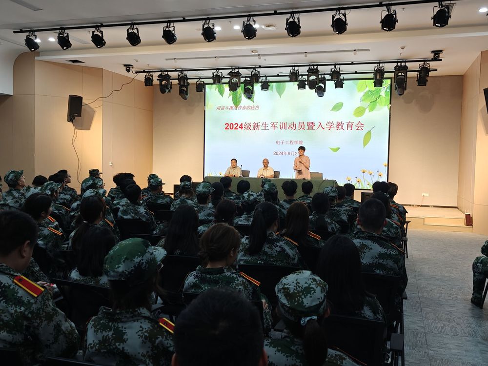 【电子工程学院】9月23日,电子工程学院在高邮湖校区大学生活动中心二楼多功能厅举行2024级新生军训动员暨入学教育大会。学院党政领导、新生班主任以及308名新同学参加了活动。大会由学院党总支书记陈久安主持。