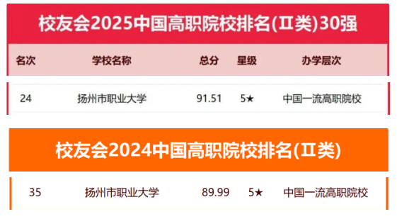 近日,全国第三方大学评价研究机构艾瑞深校友会网(Cuaa.net)正式发布《2025校友会中国大学排名:高考志愿填报指南》。榜单显示,扬州市职业大学在校友会2025中国高职院校排名(Ⅱ类)位列全国第24位,比2024年排名前进11位,首次进入该榜单前30强,这标志着学校综合办学实力迈上新台阶。