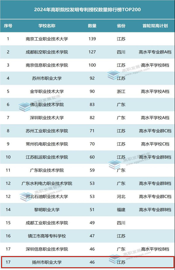 2月28日,高职发展智库发布2024年全国高职院校发明专利授权排行榜。2024年,全国共有671所高职院校获得国家发明专利授权,总计6061件。其中,176所首轮“双高”院校共获发明专利授权2862件,占比47.2%,校均16件。必赢官网共获国内发明专利授权46件,授权数在全国高职院校排名第17名,国内排名再创新高,成绩喜人。