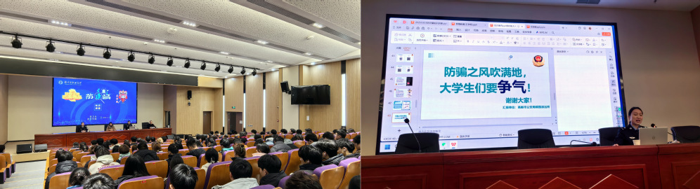 3月3日,资环学院、保卫处在高邮湖校区图书馆报告厅举办校园安全知识讲座。高邮市公安局刑警大队禁毒大队教导员王学栋警官、高邮市公安局蝶园派出所陈慧如警官分别从禁毒、防诈、反邪教三个方面进行了讲解。资环学院2024级全体同学聆听了讲座,学院党总支书记王海玫参加了活动。