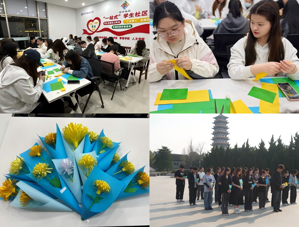 学院师生在一站式社区用蓝色、白色、黄色的纸,通过裁剪,折叠的方式自己动手,将心中对革命先烈的崇敬之情凝聚在手折菊花的制作上,一朵朵立体的纸菊花寄托着深深的哀思。