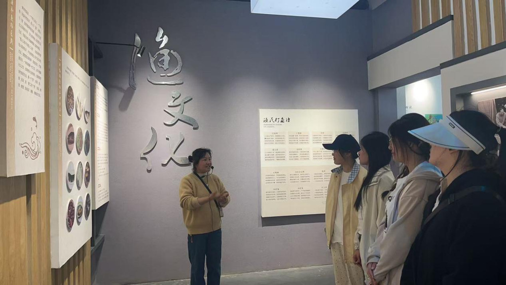 在渔家文化馆中,同学们触摸渔网、船桨等老物件,感受运河滋养的百年渔文化。村党支部通过节庆活动和村规民约凝聚民心,让“运河精神”成为村民共同的价值纽带。吴雅秋进行现场教学:“产业转型与多元发展是沿湖村蜕变的关键,乡村振兴更离不开本土文化的传承,青年们要将文化传承与时代使命相结合,投身乡村振兴的火热实践中。”