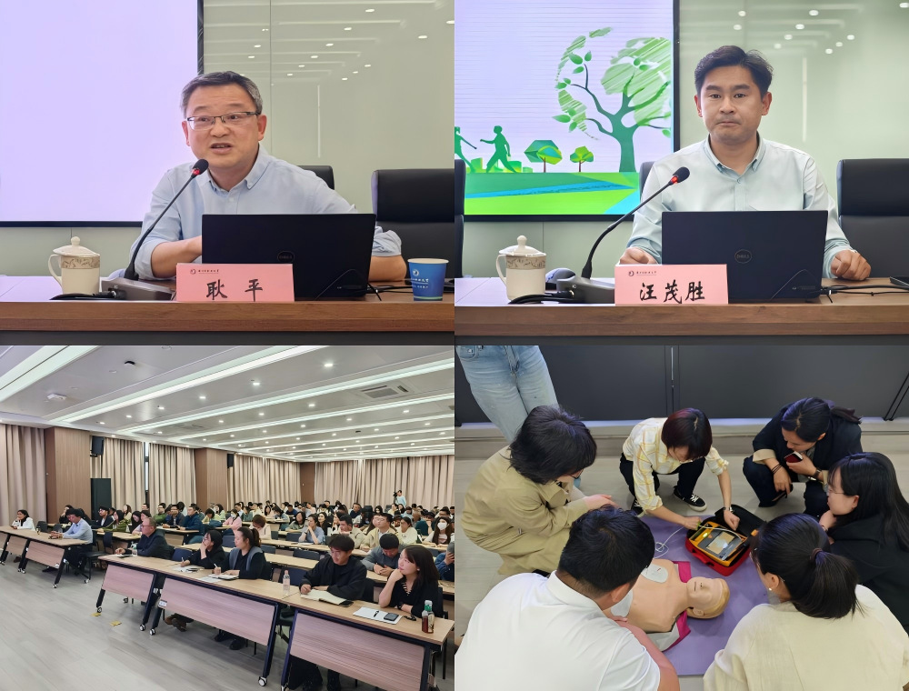 讲座分理论与实操两阶段。扬州大学附属苏北人民医院急诊医学科科主任耿平教授结合临床案例,讲解校园突发安全事件急救指南,强调“该出手时就出手”的互救理念。市急救志愿者协会秘书长、市急救中心汪茂胜副主任医师结合社会急救实例剖析“黄金4分钟”急救反应速度对挽救生命的关键作用,并现场演示AED操作技能要点,强调“第一时间施救”的实战意义。参训人员通过专家授课与模拟演练,提升突发意外中的应急处置能力。