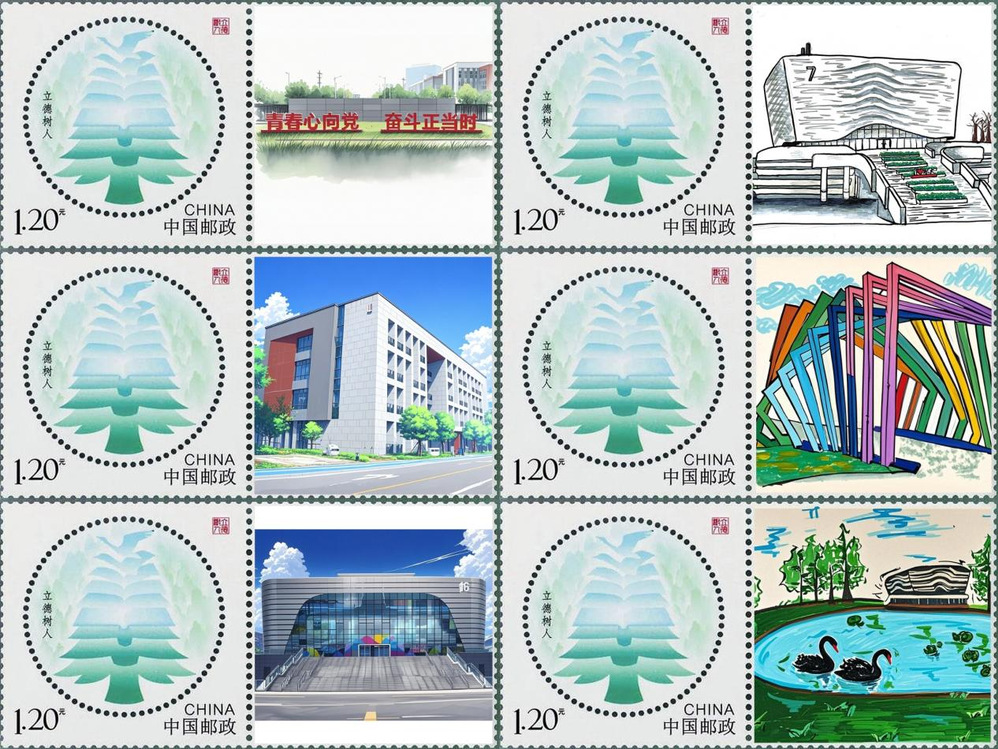 手绘职大风光邮票。春天的高邮湖校区,风景如画。“邮之声”志愿队副队长、通信2403班陈柏廷用相机镜头捕捉校园美景。光电2401郑媛希、通信2401韩芯等同学用手中画笔勾勒食堂前的“智启未来”雕塑、七星湖中的黑天鹅、体育馆、图书馆等标志性景点。“邮之声”志愿队、光电2401王思敏提议将劳动作品设计成邮票,立刻得到大家的响应。他们从风光照、绘画稿中遴选出6张,经过AI魔法唤醒后精心设计在2022年我国发行的个性化专用邮票“立德树人”的附图部分。这一套6枚扬州职大专属的风光题材邮票在师生中广为流传,颇受青睐。