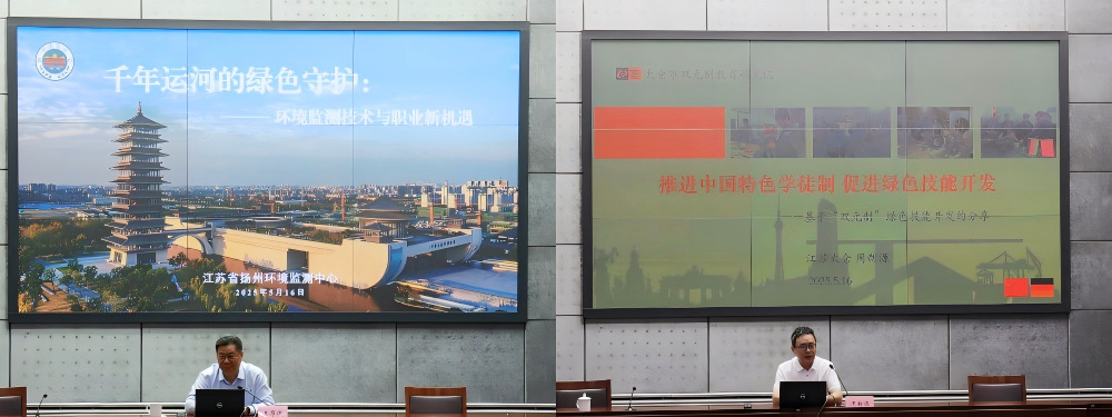 在主旨演讲环节,苏州太仓市双元制教育研究院院长周新源、江苏省扬州环境监测中心主任王厚俊带来了“《推进中国特色学徒制,促进绿色技能开发》——基于‘双元制’绿色技能开发”以及“千年运河的绿色守护:环境监测技术与职业新机遇”的精彩分享,拓宽了参会人员对于生态环境职业教育与行业发展的国际视野,同时也深入探讨了生态环境监测领域的新机遇与新挑战。