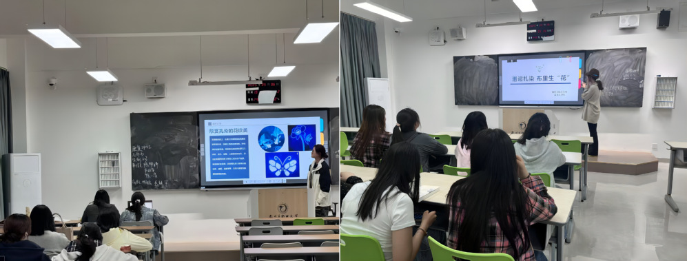 扎染社团成员黄楚英、王梦婷从扎染历史、扎染工艺流程以及扎染社团的手工制品展示等多个方面给同学们讲解了扎染艺术,让同学们直观地了解到这项古老技艺的悠久历史与制作工艺。