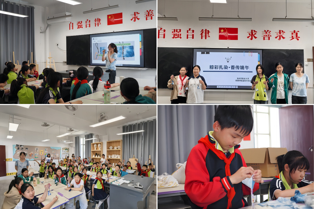 此次活动不但让孩子们体验了扎染和香囊制作,更让他们感受到传统文化就在身边。纺服学院带队教师王锴表示:“非遗需要年轻的力量,我们希望通过‘大手牵小手’的方式,让文化传承更有温度。”临泽小学负责老师谭城表示:“这场‘粽彩扎染’活动不只是一次手工体验,更是一场跨越千年的文化对话。”纺服学院与临泽小学的联动,正以匠心与热爱,编织着非遗传承的未来。