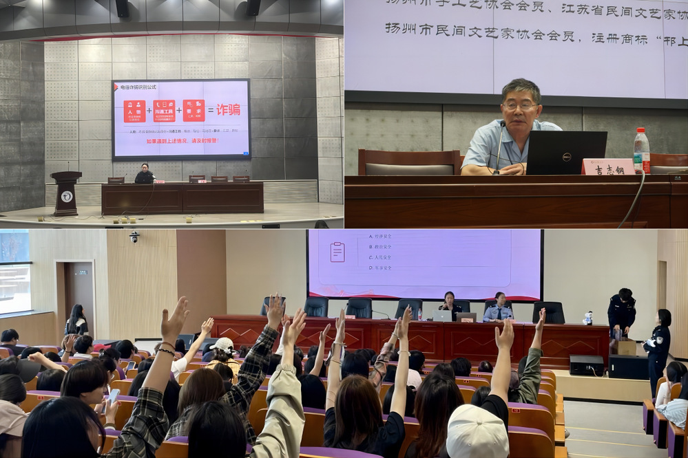 学生工作部以系列讲座为主要阵地,倡议树文明风范、建文明校园,组织开展了2场安全文明讲堂和1场非遗文化专题讲座。4月2日下午,在瘦西湖校区映月学术报告厅,扬州市公安局邗江分局新盛派出所社区民警伍旭妍生动地上了一场“预防电信网络诈骗”小课堂,用实际案例提醒如何预防电信诈骗;4月16日下午,在高邮湖校区图书馆报告厅,高邮市公安局蝶园派出所社区民警陈慧如开展了一场“国家安全教育和反诈宣传教育”,创新采用现场互动的方式检验同学们的学习效果,让安全教育更加记忆深刻;5月22日下午,在瘦西湖校区映月报告厅,扬州砖雕广陵区非物质文化遗产代表性传承人吉志钢带来了一场扬州非遗文化盛宴,通过讲述他的砖雕作品,引导同学们领略了扬州非遗文化的风采与魅力。