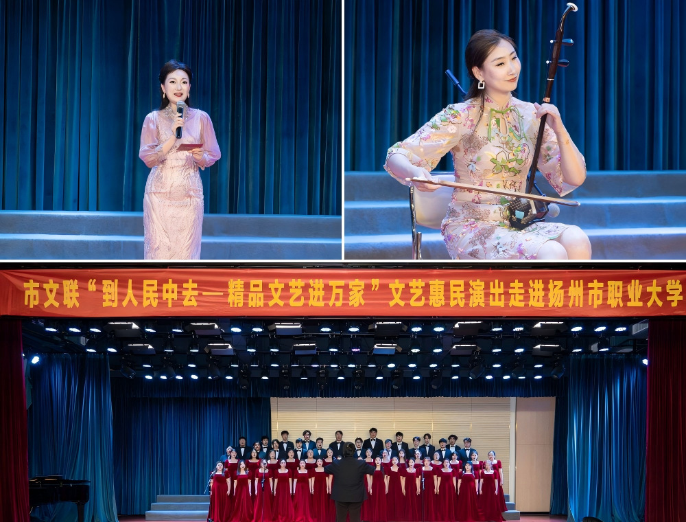 演出由主持人周倩优雅开篇,大合唱《长城》作为开场节目,瞬间点燃现场氛围。艺术学院王子仪、李凯等学生在指挥夏正祎的引领下,以恢弘合唱勾勒长城的雄伟壮阔,传递出深厚家国情怀,展现校地合作艺术育人成果。二胡独奏《战马奔腾》中,扬州市音乐家协会副秘书长王萃用激昂弦音,生动模拟战马嘶鸣、冲锋陷阵的场景,将传统乐器的艺术感染力拉满。扬州文联艺术团执行团长周倩,以一级演员的深厚功底,带来扬州弹词《运河上的船娘》,婉转说唱讲述运河故事,尽显地方曲艺韵味。刘玥彤、邓雨馨等学生演绎三人舞《绣》,用灵动舞姿诠释传统工艺之美,展现青春艺术活力。扬州市戏剧家协会副主席孙爱民以一级演员身份演唱扬剧《鸿雁传书》《金玉良缘》选段,字正腔圆间,扬剧独特魅力扑面而来。