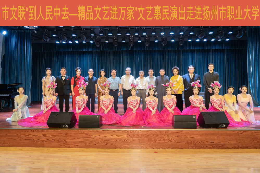 为弘扬中华优秀传统文化,丰富校园文化生活,提升师生艺术素养,6月20日,由扬州市文联主办的“到人民中去——精品文艺进万家”文艺惠民演出活动在学校映月剧场举行。校党委书记马顺圣,党委副书记、校长周春光,扬州市文联党组书记、主席黄振宇,校党委委员、副校长花军,扬州市文联党组成员、副主席吴乃怀,与师生共赴这场文艺盛宴,感受艺术魅力。