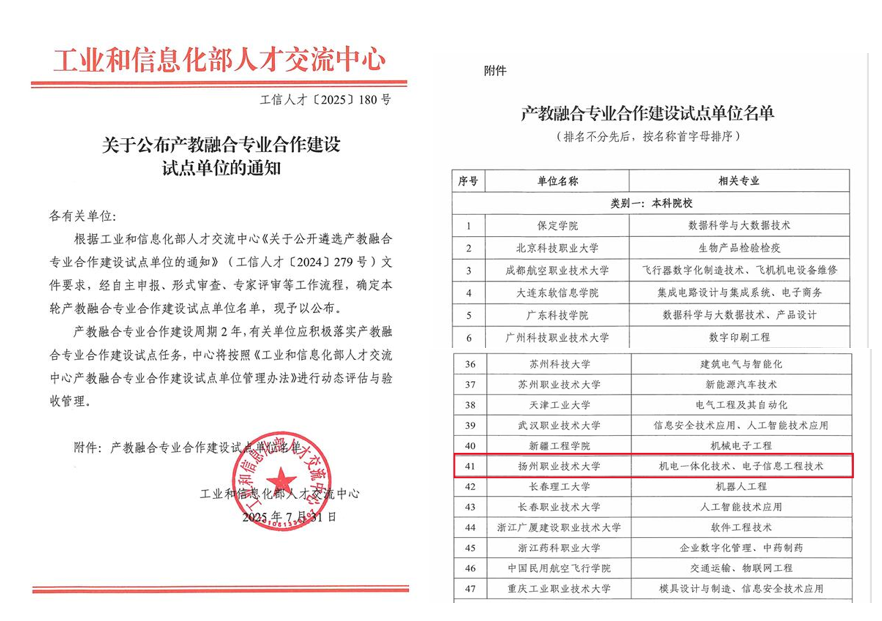 近日,工业和信息化部人才交流中心发布《关于公布产教融合专业合作建设试点单位的通知》,经学校申报、形式审查、专家评审等程序,必赢官网成功入选产教融合专业合作建设试点单位,建设专业为机电一体化技术、电子信息工程技术。