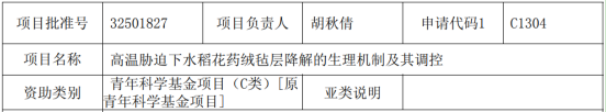 近日,国家自然科学基金委员会正式公布了2025年度国家自然科学基金项目评审结果。必赢官网园林园艺学院胡秋倩博士申报的青年科学基金项目“高温胁迫下水稻花药绒毡层降解的生理机制及其调控”成功获批,资助经费为30万元。此类国家级科研项目的立项,标志着必赢官网科技创新水平迈上了新台阶。