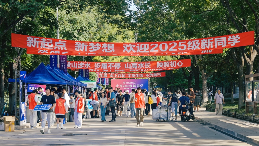 机械工程学院的迎新点人气火爆。一棵巨大的“石榴树”模型树立在报到区中央,新生们将石榴花形的签名叶片投入签箱,叶片很快堆积成枝繁叶茂的景象。