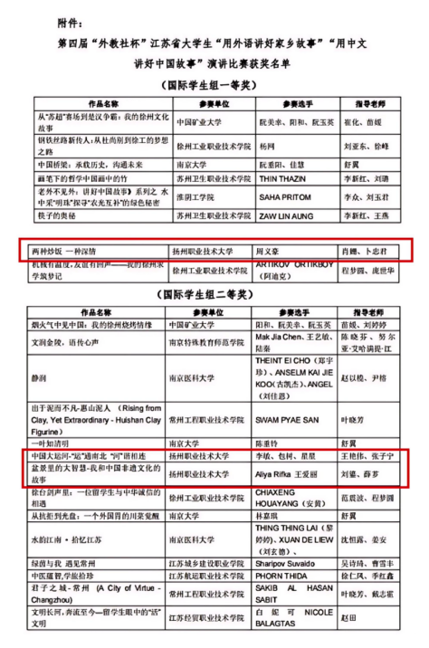 此次比赛由江苏省高等教育学会指导,江苏省高等学校外国语教学研究会、“学习强国” 江苏学习平台和上海外语教育出版社共同主办,旨在激励学生讲好中国故事,传播中国声音。国际交流学院高度重视,精心组织指导,最终选送的《两种炒饭,一种深情》荣获一等奖,《中国大运河—“运”通南北 “和”谐相连》和《盆景里的大智慧—我和中国非遗文化的故事》获二等奖。