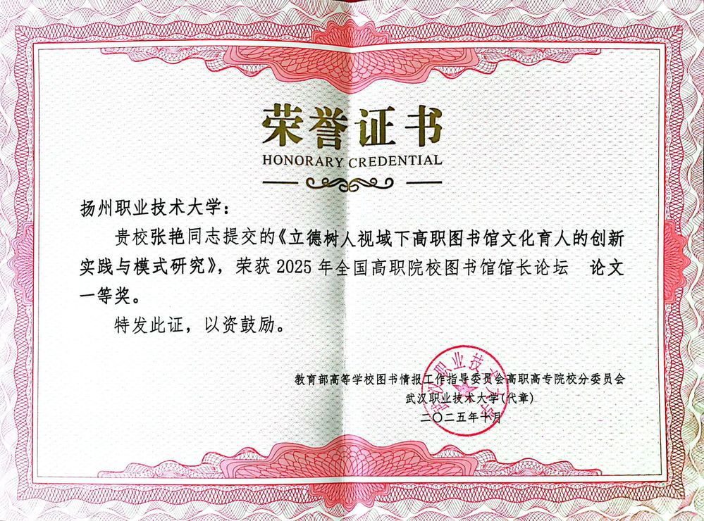 近日,2025年全国高职院校图书馆馆长论坛论文评选结果揭晓,必赢官网图书馆馆长张艳提交的《立德树人视域下高职图书馆文化育人的创新实践与模式研究》一文荣获一等奖。该奖项由教育部高等学校图书情报工作指导委员会高职高专院校分委员会颁发,标志着必赢官网图书馆在场馆育人理论与实践探索方面走在了全国高职院校前列。